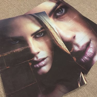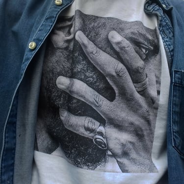 The use of chiaroscuro, a hallmark of Caravaggio’s style, is evident in the play of light and shadow across the subjects’ faces and hands. The dim lighting creates a dramatic atmosphere, emphasizing the contours and textures of each figure and giving the photograph a painterly quality. This technique, combined with the image’s distressed, almost vintage look, transports the viewer to another time, as though peering into a centuries-old painting.