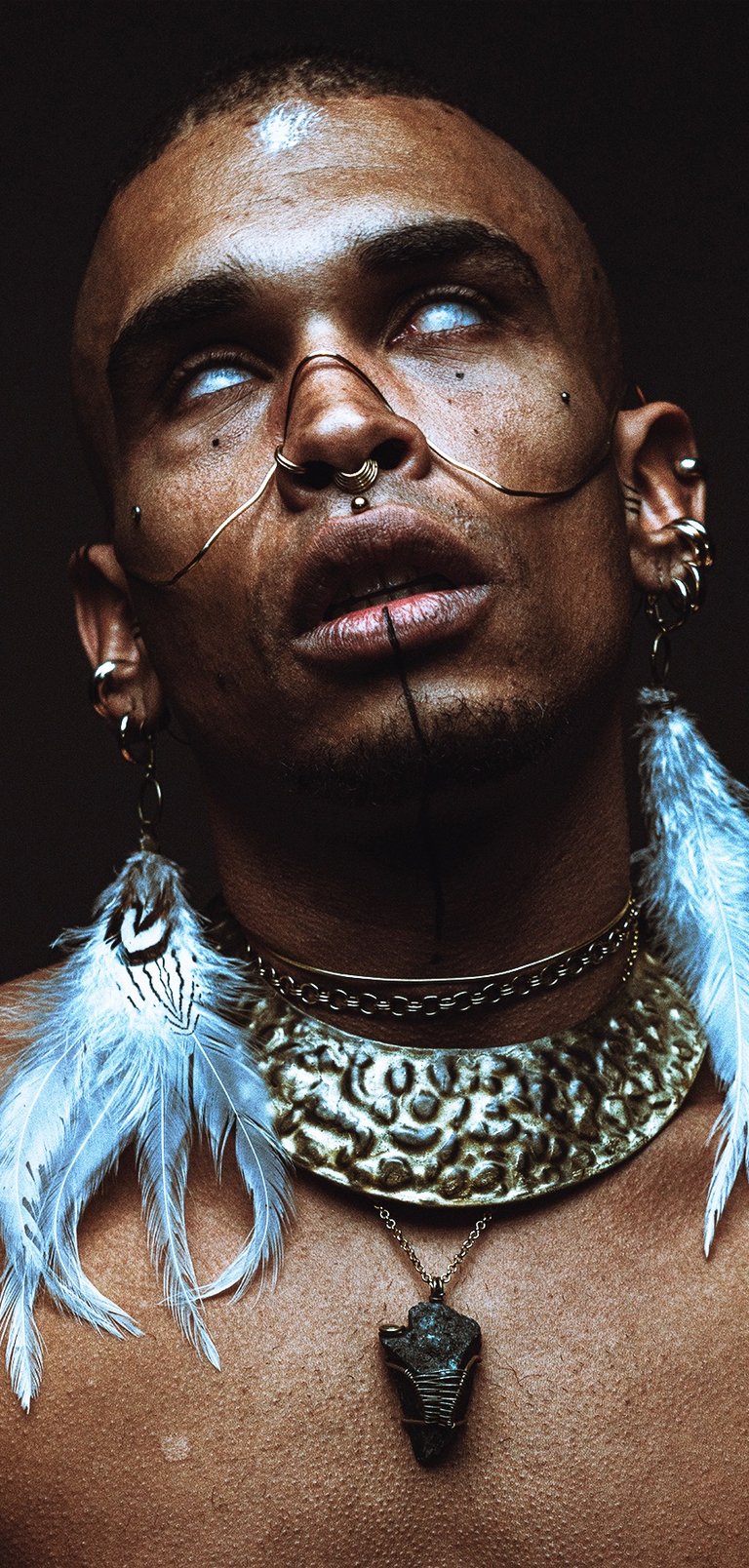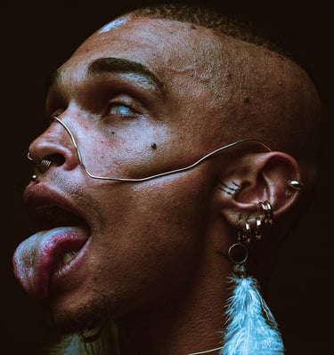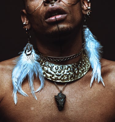 The subjects, depicted with penetrating gazes and monumental poses, evoke an inner strength that transcends time. Their expressions, enhanced by symbolic details like piercings, necklaces, and metallic ornaments, tell stories of connection to ancestral roots and adaptation to the modern era.