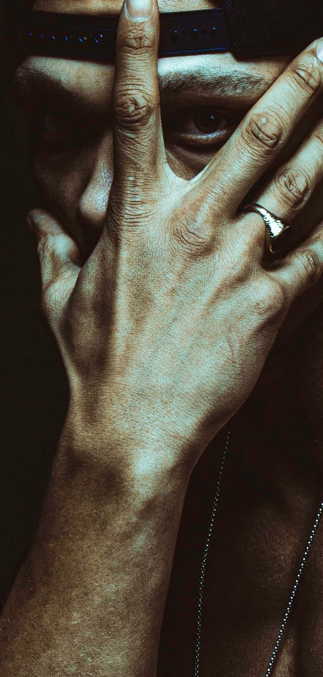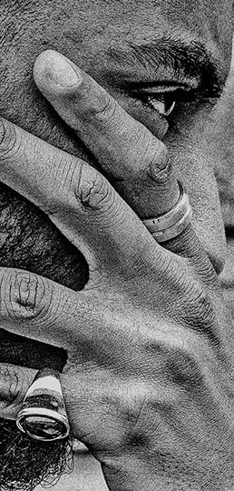 In these photographs, the subjects appear in monumental, almost hieratic poses that reveal an inner, combative strength. Their faces are intense, with penetrating gazes that tell stories of challenge and adaptation, symbols of resilience in an often-hostile urban environment. The hands touching the face or partially covering their features add an element of introspection, suggesting a hidden vulnerability behind their strength.